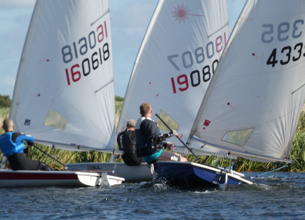 It was Mark Scourfield who judged it best and was away from the bunch led by Adam Stabler in the Laser full rig, Laser Radials of Alaistair Mitchell, Alan Cox and Sandor Kecskemeti, who had recovered from a capsize before the start, the Laser2000 of Neil Tack and Rebecca Slator, Laser4.7 of William Stabler and Solos of Alan Thompson and Geoff Tibbs.
