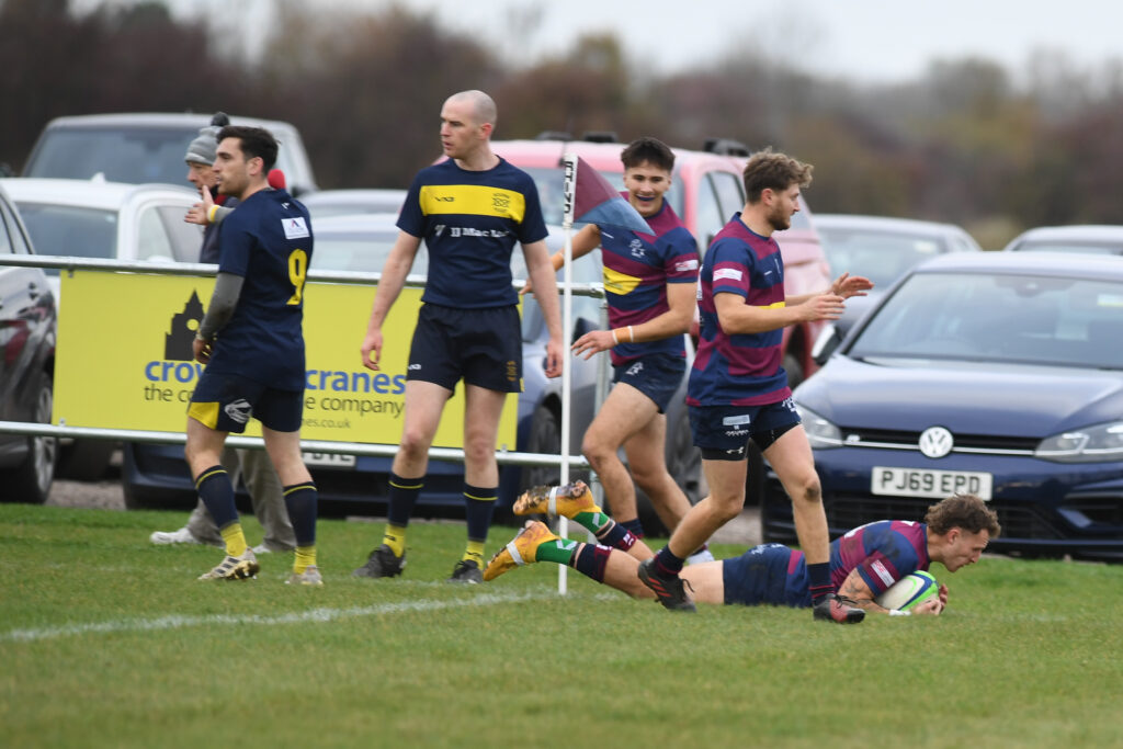 By now Spalding backs were passing and running at pace, scrum half Jim Wraith made a break down the right flank, passed back inside to Henry Duce, who offloaded to full back Ollie Machin bursting through and as he was tackled a pass out to Wraith, who continued to support, saw him dive over the line for a standout try.
